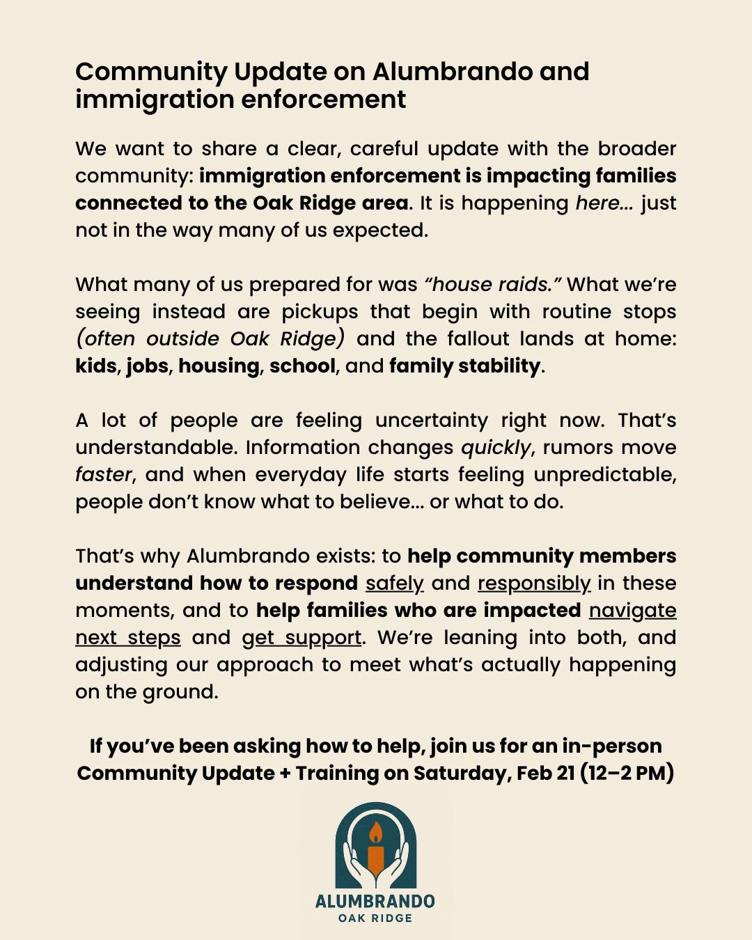 Immigration enforcement is impacting families connected to the Oak Ridge area. It is happening here… just not in the way many of us expected. What many of us prepared for was “house raids.” What we’re seeing instead are pickups that begin with routine stops (often outside Oak Ridge) and the fallout lands at home: kids, jobs, housing, school, and family stability.