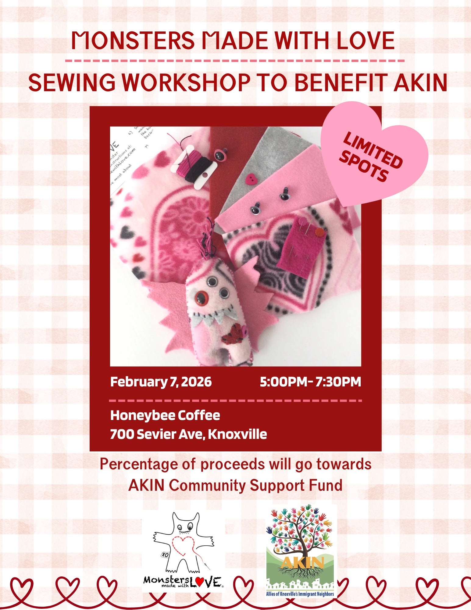 Spend an evening stitching up your own quirky fleece creature while supporting AKIN – Allies of Knoxville’s Immigrant Neighbors. Perfect for beginners and seasoned crafters alike, this hands-on workshop guides you through simple hand-sewing techniques to bring your monster to life. Celebrate what makes you unique by designing a companion that captures your personality. Everything you need is provided, and no prior experience required. Welcome to all ages 12 and up. Â Bring your love, a friend or celebrate on your own!