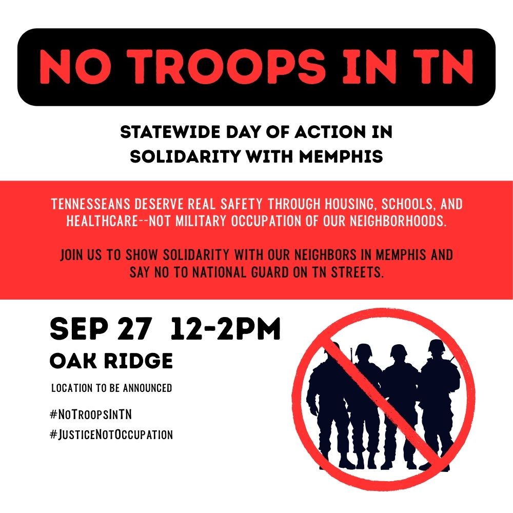 Tennesseans deserve real safety through housing, schools, and healthcare–not military occupation of our neighborhoods. Join us on September 27th to show solidarity with our neighbors in Memphis and say NO to National Guard on Tennessee streets.