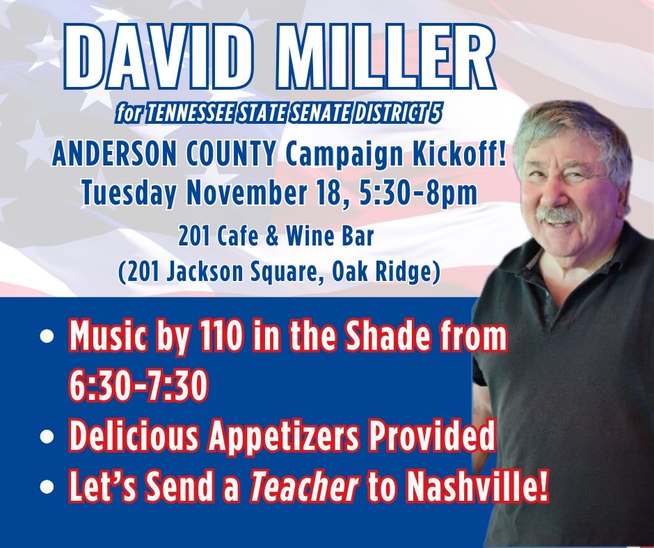 Come meet David Miller, teacher and candidate for Tennessee State Senate District 5, and enjoy some local music and delicious appetizers. |